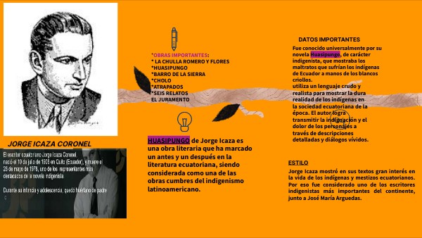 Jorge Icaza mostró en sus textos gran interés en la vida de los indígenas y mestizos ecuatorianos. Por eso fue considerado uno de los escritores indigenistas más importantes del continente, junto a José María Arguedas.