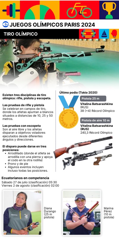Existen tres disciplinas de tiro olímpico: rifle, pistola y escopeta. Las pruebas de rifle y pistola Se celebran en campos de tiro, donde los atletas apuntan a blancos situados a distancias de 10, 25 y 50 metros. Las pruebas con escopeta Son al aire libre y los atletas disparan a objetivos voladores ejecutados desde diferentes ángulos y direcciones. El disparo puede darse en tres posiciones: