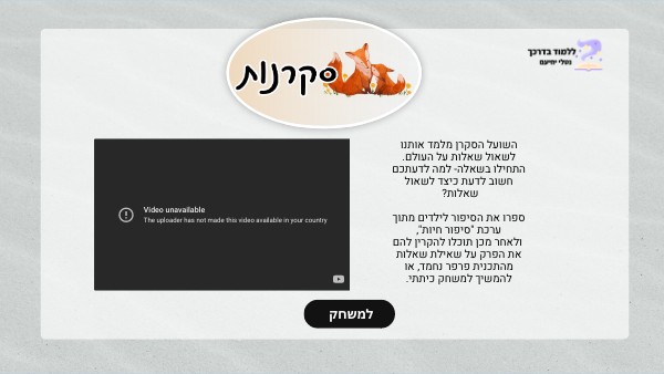 השועל הסקרן מלמד אותנו לשאול שאלות על העולם. התחילו בשאלה- למה לדעתכם חשוב לדעת כיצד לשאול שאלות? ספרו את הסיפור לילדים מתוך ערכת "סיפור חיות", ולאחר מכן תוכלו להקרין להם את הפרק על שאילת שאלות מהתכנית פרפר נחמד, או להמשיך למשחק כיתתי.