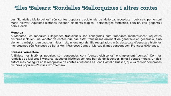 Les "Rondalles Mallorquines" són contes populars tradicionals de Mallorca, recopilats i publicats per Antoni Maria Alcover. Aquestes històries inclouen elements màgics i personatges fantàstics, com bruixes, gegants i herois locals. Menorca A Menorca, les rondalles i llegendes tradicionals són conegudes com "rondalles menorquines". Aquestes històries inclouen una varietat de contes que han estat transmesos oralment de generació en generació, amb elements màgics, personatges mítics i situacions morals. Els recopiladors més destacats d'aquestes històries menorquines són Francesc de Borja Moll i Francesc Camps i Mercadal, més conegut com Francesc d’Albranca. Eivissa i Formentera A Eivissa, les històries populars són conegudes com "contes eivissencs" o simplement "contes". Com les rondalles de Mallorca i Menorca, aquestes històries són una barreja de llegendes, mites i contes morals. Un dels autors més coneguts en la recopilació de contes eivissencs és Joan Castelló Guasch, que va recollir nombroses històries populars d'Eivissa i Formentera.