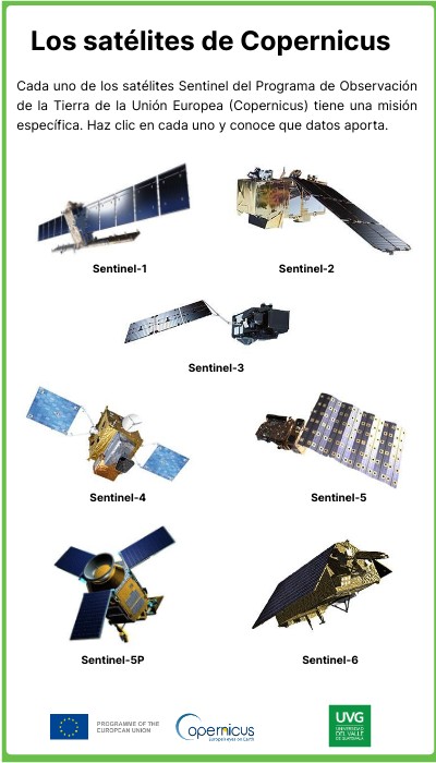 Cada uno de los satélites Sentinel del Programa de Observación de la Tierra de la Unión Europea (Copernicus) tiene una misión específica. Haz clic en cada uno y conoce que datos aporta.
