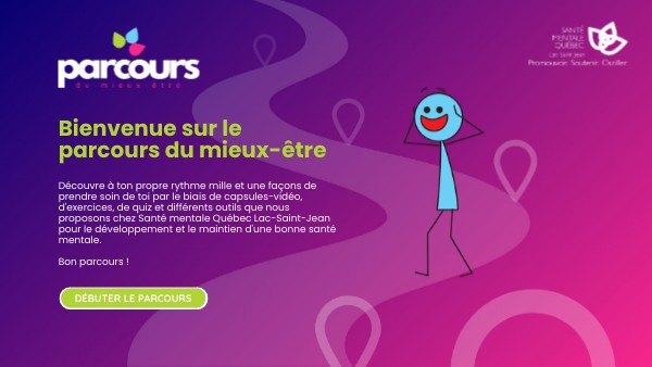 Ce parcours se veut interactif et a pour objectif d'explorer à son propre rythme les différents outils que nous proposons chez Santé mentale Québec Lac-Saint-Jean pour le développement et le maintien d'une bonne santé mentale.