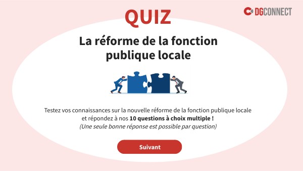 Ce quiz a été élaboré sur base des contenus disponibles sur DGConnect. Vous trouverez tous les éléments de réponse de ce questionnaire dans notre dossier thématique consacré à la fonction publique locale. Cliquez ici pour le consulter. Pour commencer le quiz, cliquez sur le bouton ci-dessous.