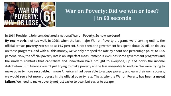 In 1964 President Johnson, declared a national War on Poverty. So how we done?By one metric, not too well. In 1966, when the last major War on Poverty programs were coming online, the official census poverty rate stood at 14.7 percent. Since then, the government has spent about 20 trillion dollars on these programs. And with all this money, we've only dropped the rate by about one percentage point, to 13.5 percent. Now, the official poverty rate is an imperfect measurement. It excludes some government programs and the modern comforts that capitalism and innovation have brought to everyone, up and down the income distribution. But America wasn't just trying to make poverty a little less miserable to endure. We were trying to make poverty more escapable. If more Americans had been able to escape poverty and earn their own success, we would see a lot more progress in the official poverty rate. That's why the War on Poverty has been a moral failure. We need to make poverty not just easier to bear, but easier to escape.