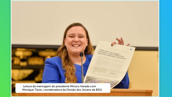 Leitura da mensagem do presidente Minoru Harada com Monique Tiezzi, coordenadora da Divisão dos Jovens da BSGI