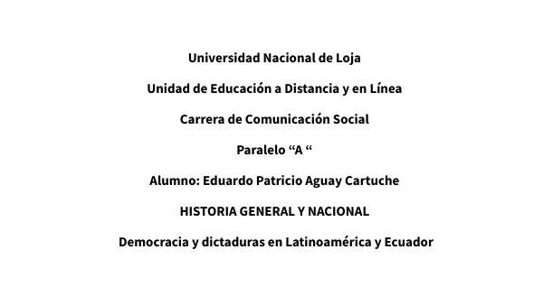 Universidad Nacional de Loja Unidad de Educación a Distancia y en Línea Carrera de Comunicación Social Paralelo “A “ Alumno: Eduardo Patricio Aguay Cartuche HISTORIA GENERAL Y NACIONAL Democracia y dictaduras en Latinoamérica y Ecuador