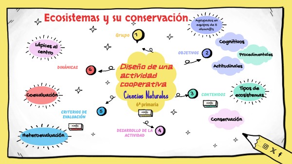 La actividad se divide en cuatro fases:1.- Reparto de roles. Cada miembro del grupo asume un rol (líder, investigador, relator, diseñador, y presentador). Esto ayuda a estructurar el trabajo en equipo y asegurar que todos participen activamente y Fomenta la responsabilidad individual y la interdependencia positiva, dos pilares del trabajo cooperativo. 2.- Investigación. Cada grupo investiga un tipo de ecosistema (bosque, desierto, tundra, etc.). Utilizando diversas fuentes (libros, artículos, videos) y herramientas TIC (Google Scholar, YouTube, etc.).