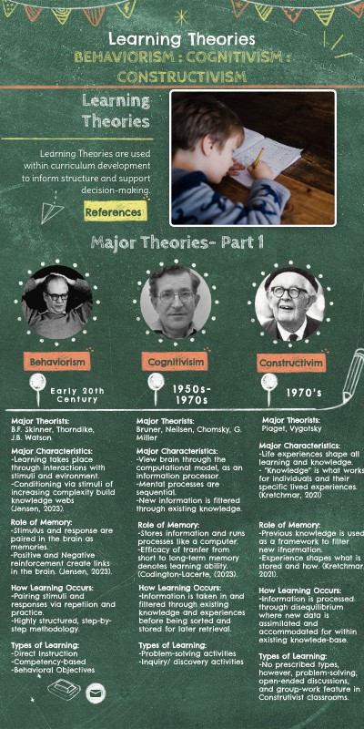 Codington-Lacerte, C. (2023). Cognitivism (psychology). Salem Press Encyclopedia. Gould, M. (2021). Learning Process. Salem Press Encyclopedia. Jensen, R. (2023). Behaviorism. Salem Press Encyclopedia of Health. Kretchmar, J. (2021). Constructivism. Salem Press Encyclopedia.