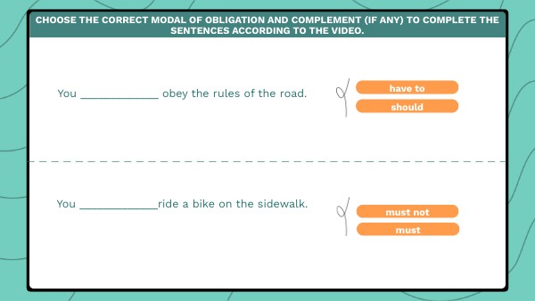 choose the correct modal of obligation and complement (if any) to complete the sentences according to the video.