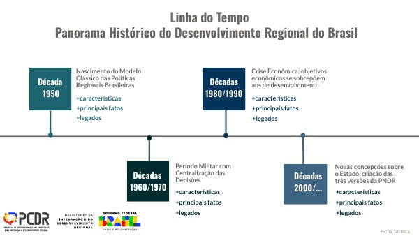 2003 – Criação da Câmara de Políticas de Integração Nacional e Desenvolvimento Regional, do Conselho de Governo;2003 – Tânia Bacelar propõe a criação da PNDR;2007 – Instituição da PNDR I; 2007 – Sudam e Sudene são recriadas; 2009 – Sudeco é recriada; 2009 - Criação do Fundo de Desenvolvimento do Centro-Oeste – FDCO; 2012 – Realização da I Conferência Nacional de Desenvolvimento Regional – CNDR;2019 – Instituição da PNDR II;2023 – Consulta pública sobre a PNDR;2024 – Instituição da PNDR III.