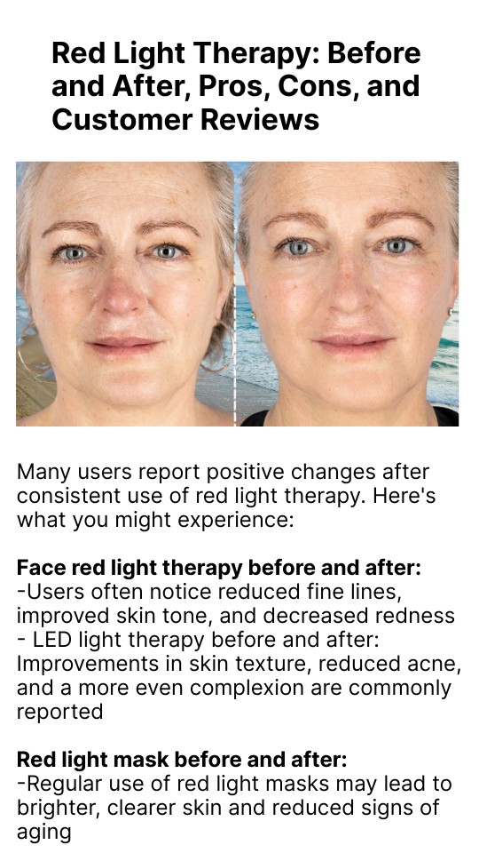 Many users report positive changes after consistent use of red light therapy. Here's what you might experience: Face red light therapy before and after: -Users often notice reduced fine lines, improved skin tone, and decreased redness - LED light therapy before and after: Improvements in skin texture, reduced acne, and a more even complexion are commonly reported Red light mask before and after: -Regular use of red light masks may lead to brighter, clearer skin and reduced signs of aging