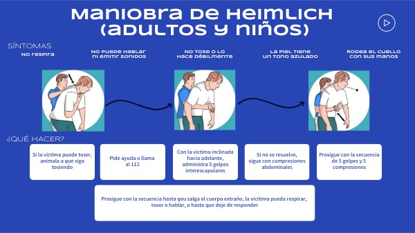 Prosigue con la secuencia hasta qeu salga el cuerpo extraño, la vícitima pueda respirar, toser o hablar, o hasta que deje de responder
