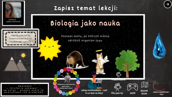 1. Przypomnienie z klasy 4 - czym jest przyroda i jak się ją dzieli2. Czym jest biologia? - układanie puzzli 3. Przypomnienie wspólnych cech organizmów - obserwacja żywych okazów organizmów i tooltip 4. Czynności życiowe - quiz i uzupełnianie sketchnotki lub karty pracy 5. Hierarchiczna budowa organizmów - zabawa z klockami lego + quiz w Learning Apps 6. Działy biologii - skojarz obrazki i uzupełnij sketchnotkę lub kartę pracy 7. Escape room - "Czy jesteś organizmem?" 8. Podsumowanie - kahoot