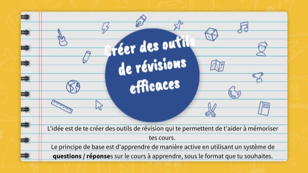 L'idée est de te créer des outils de révision qui te permettent de t'aider à mémoriser tes cours. Le principe de base est d'apprendre de manière active en utilisant un système de questions / réponses sur le cours à apprendre, sous le format que tu souhaites.