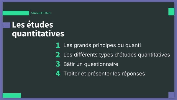 Les grands principes du quanti Les différents types d'études quantitatives Bâtir un questionnaire Traiter et présenter les réponses