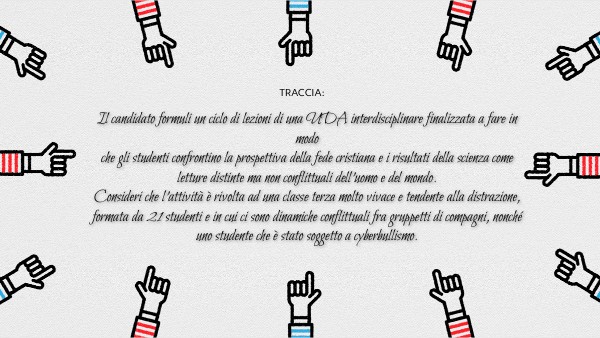 Il candidato formuli un ciclo di lezioni di una UDA interdisciplinare finalizzata a fare in modo che gli studenti confrontino la prospettiva della fede cristiana e i risultati della scienza come letture distinte ma non conflittuali dell’uomo e del mondo. Consideri che l’attività è rivolta ad una classe terza molto vivace e tendente alla distrazione, formata da 21 studenti e in cui ci sono dinamiche conflittuali fra gruppetti di compagni, nonché uno studente che è stato soggetto a cyberbullismo.