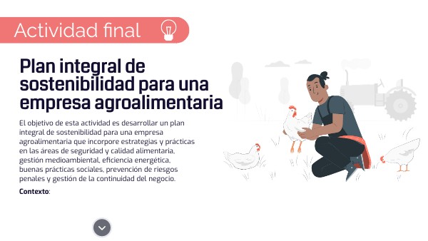 El objetivo de esta actividad es desarrollar un plan integral de sostenibilidad para una empresa agroalimentaria que incorpore estrategias y prácticas en las áreas de seguridad y calidad alimentaria, gestión medioambiental, eficiencia energética, buenas prácticas sociales, prevención de riesgos penales y gestión de la continuidad del negocio. Contexto: