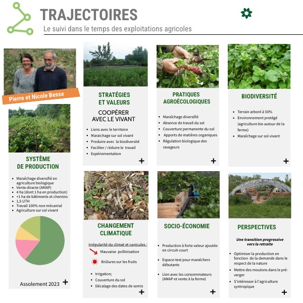 Pierre Besse, diplômé ingénieur agronome en 1981, entreprend sa première installation en maraîchage à Ramonville en 1990, sur des terres prêtées où il cultive pendant huit saisons sur 2 hectares. En 1997, il acquiert avec sa femme Nicole l'exploitation actuelle, près de Lagardelle-sur-Lèze. De 1999 à 2006, il exerce en GAEC en agriculture biologique avec deux associés. Motivée par les valeurs portées par ce modèle d'agriculture (autoconsommation, résilience...), Nicole quitte son poste d'enseignante-chercheuse pour devenir agricultrice en 2006. C'est la force du couple qui a permis à l'activité maraîchère de perdurer jusqu'à aujourd'hui. L’AMAP de la Digue est créée. Depuis 7 ans, des panneaux photovoltaïques produisent une partie de l'énergie (1000W) nécessaire à leurs usages personnels, l’irrigation (les pompes utilisées consomment 1200W chacune) et les nappes chauffantes (réalisation des semis). En 2024, le rythme de travail est ralenti afin de réaliser une transition progressive vers la retraite.