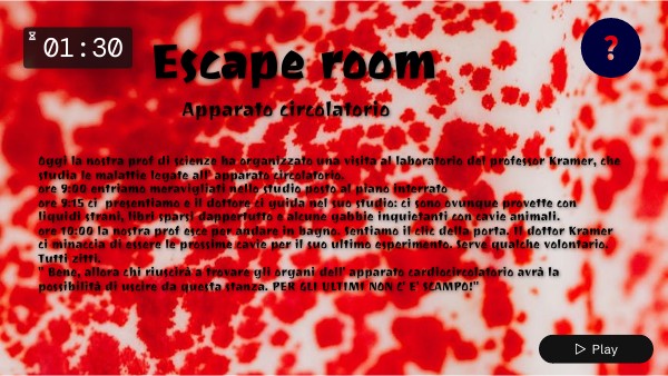 Quest' oggi sarete messi a dura prova in un escape room sull' apparato circolatorio e il sistema linfatico. Il vostro obiettivo sarà ricostruirli entrambi tramite gli organi che troverete durante l' escape room. Per iniziare clicca su play. Ricordati di cliccare sempre per primo il punto di domanda prima di cominciare le prove a cui verrai sottoposto e segui successivamente le istruzioni.