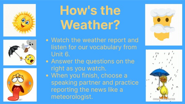 - Watch the weather report and listen for our vocabulary from Unit 6.
