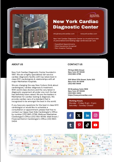 115 East 86th StreetNew York, NY 10028(212) 860-0796 200 West 57th Street, Suite 200New York, NY 10019(212) 582-8006 65 Broadway Suite 1806New York, NY 10006(212) 860-5404https://newyorkcardiac.com
