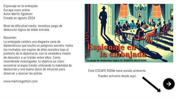 Espionaje en la embajadaEscape room online Autor Martín Sgattoni Creado en agosto 2024. Nivel de dificultad medio, temática juego de deducción lógica de doble entrada. Resumen: La embajada celebra una elegante cena de diplomáticos que oculta un peligroso secreto: todos los invitados son espías de élite reunidos bajo el pretexto de la diplomacia, con la verdadera misión de descubrir a un traidor entre ellos. Como renombrado investigador, tu objetivo es claro: encontrar al espía traidor utilizando tu habilidad de deducción y una buena dosis de intuición para observar y asociar las pistas. www.martinsgattoni.com