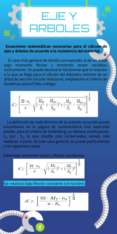Ecuaciones matemáticas necesarias para el cálculo de ejes y árboles de acuerdo a la resistencia del material. El caso más general de diseño corresponde al de un árbol bajo momento flector y momento torsor variables cíclicamente. Se puede demostrar fácilmente que la relación a la que se llega para el cálculo del diámetro mínimo de un árbol de sección circular maciza es, empleando el criterio de Goodman para el fallo a fatiga: