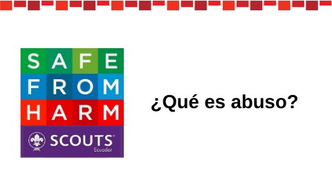 Cualquier acto sexual, insinuación o exposición inapropiada que involucre a un menor de edad. Si alguien les hace sentir incómodos o les pide hacer cosas sexuales, es importante que lo denuncien con confianza a un adulto responsable como un líder scout, maestro o familiar. Ellos podrán ayudarles y asegurarse de que reciban apoyo.