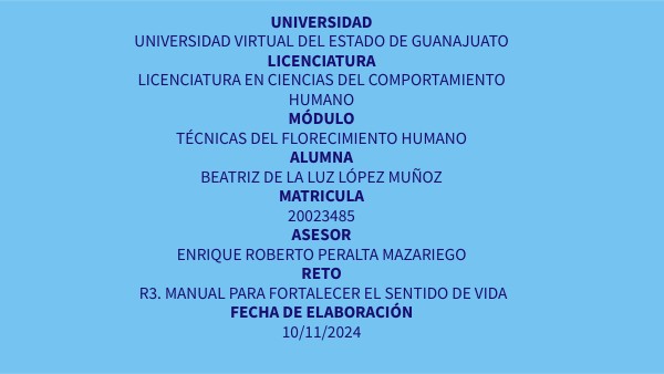 UNIVERSIDAD UNIVERSIDAD VIRTUAL DEL ESTADO DE GUANAJUATO LICENCIATURA LICENCIATURA EN CIENCIAS DEL COMPORTAMIENTO HUMANO MÓDULO TÉCNICAS DEL FLORECIMIENTO HUMANO ALUMNA BEATRIZ DE LA LUZ LÓPEZ MUÑOZ MATRICULA 20023485 ASESOR ENRIQUE ROBERTO PERALTA MAZARIEGO RETO R3. MANUAL PARA FORTALECER EL SENTIDO DE VIDA FECHA DE ELABORACIÓN 10/11/2024