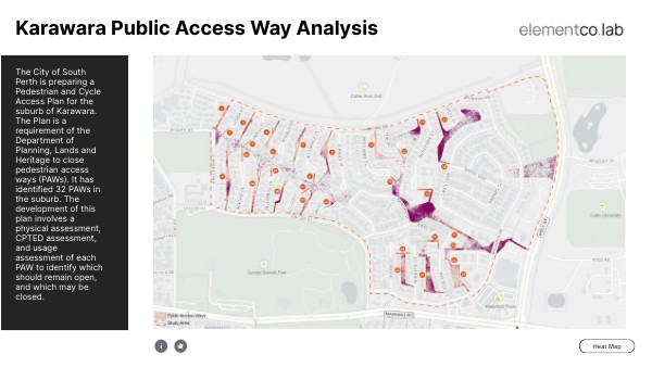 The City of South Perth is preparing a Pedestrian and Cycle Access Plan for the suburb of Karawara. The Plan is a requirement of the Department of Planning, Lands and Heritage to close pedestrian access ways (PAWs). The City has identified 32 PAWs in the suburb. The development of this plan involves a physical assessment, CPTED assessment, and usage assessment of each PAW to identify which should remain open, and which may be closed.