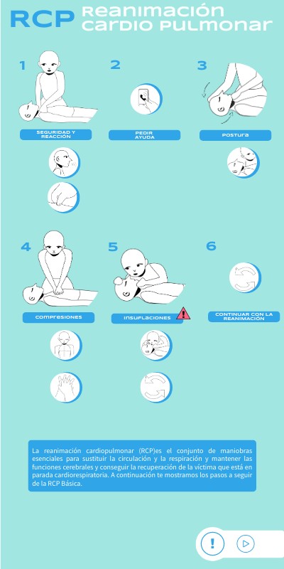 La reanimación cardiopulmonar (RCP)es el conjunto de maniobras esenciales para sustituir la circulación y la respiración y mantener las funciones cerebrales y conseguir la recuperación de la víctima que está en parada cardiorespiratoria. A continuación te mostramos los pasos a seguir de la RCP Básica.