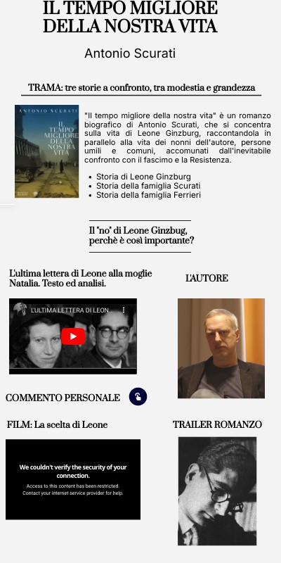 "Il tempo migliore della nostra vita" è un romanzo biografico di Antonio Scurati, che si concentra sulla vita di Leone Ginzburg, raccontandola in parallelo alla vita dei nonni dell'autore, persone umili e comuni, accomunati dall'inevitabile confronto con il fascimo e la Resistenza.