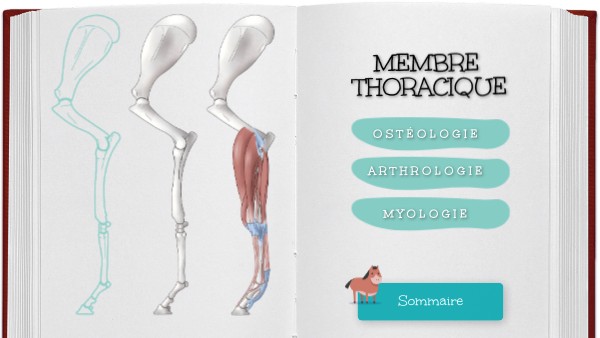 L'étude du membre thoracique se divise en trois parties : - l'ostéologie, qui s'intéressera à décrire les os compris entre le carpe inclus et la dernière phalange ; - l'arthrologie, qui montrera les relations articulaires entre ces différents os ; - et la myologie, qui décrira les muscles s’organisant autour de ces os ainsi que leur rôle dans le mouvement. Cliquez sur la catégorie souhaitée pour en apprendre plus.