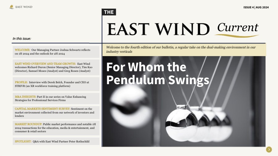 that are otherwise difficult to achieve, while many companies that raised money during ZIRP have unique valuation dynamics in play when assessing strategic alternatives. David Kaufthal and Jason Birke return in this edition to discuss how professional service firms should be thinking about true competitive advantage, while avoiding false positives. East Wind’s culture and approach is greatly influenced by the experiences of many of its bankers at much larger firms earlier in their careers. We are alumni from firms such as Bear Stearns, JP Morgan, Goldman Sachs, Morgan Stanley, Schroders and UBS. Peter Rothschild is a great example. Peter is a seasoned veteran of Wall Street, who, among other things, shared a common experience with yours truly and our Chairman Ilan Kaufthal within the unique culture at Bear Stearns. Peter offers his perspective on various topics including how the investment banking profession has changed over the course of decades. We also feature four new additions to the East Wind Team, as we continue to thoughtfully and selectively add the highest quality talent to better service our clients’ needs. The title of this edition is “For Whom the Pendulum Swings”. The image is of Newton’s Cradle Balance Pendulum, which demonstrates Newton’s third law of motion: For every action there is an equal and opposite reaction. Since early 2024 the market’s tone has improved considerably. We are clearly at an inflection point, with substantial pent up demand for realizations, structural imperatives to “put money to work” and reasons to believe that the fear of recession has justifiably receded. All of this suggests the pendulum of leverage between buyers/investors and sellers/issuers may be slowing if not reversing its swing in favor of the former. But there remains a plethora of uncertainty, including the pace of interest rate cuts, the outcome of elections, the risk of escalating geopolitical conflict, and the impact of AI, any or all of which may produce untoward impacts on the momentum that has been building. We know we cannot ignore the laws of physics, and while we remain optimistic, we will be poised and prepared for any environment we find ourselves operating in, bringing persistence and creativity in pursuit of our clients’ objectives.