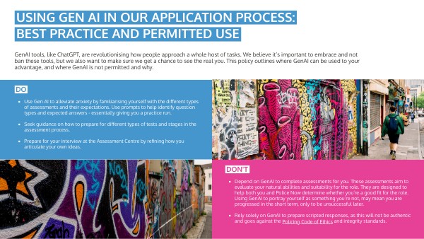 - Depend on GenAI to complete assessments for you. These assessments aim to evaluate your natural abilities and suitability for the role. They are designed to help both you and Police Now determine whether you’re a good fit for the role. Using GenAI to portray yourself as something you’re not, may mean you are progressed in the short term, only to be unsuccessful later.