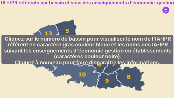 Cliquez sur le numéro de bassin pour visualiser le nom de l'IA-IPR référent en caractère gras couleur bleue et les noms des IA-IPR suivant les enseignements d'économie gestion en établissements (caractères couleur noire). Cliquez à nouveau pour faire disparaître les informations.