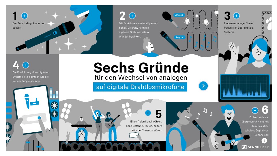 Natürlich hören wir Klang analog, doch das bedeutet nicht, dass Künstler*innen und ihr Publikum auf die vielen Vorteile digitaler Drahtlosmikrofone verzichten müssen. In manchen Umgebungen kann es sogar entscheidend sein, von analogen auf digitale Systeme umzusteigen. Hier kommen sechs gute Gründe für den Wechsel.