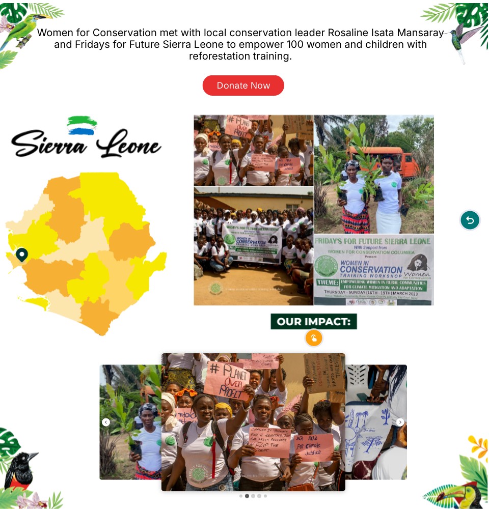 Women for Conservation met with local conservation leader Rosaline Isata Mansaray and Fridays for Future Sierra Leone to empower 100 women and children with reforestation training.