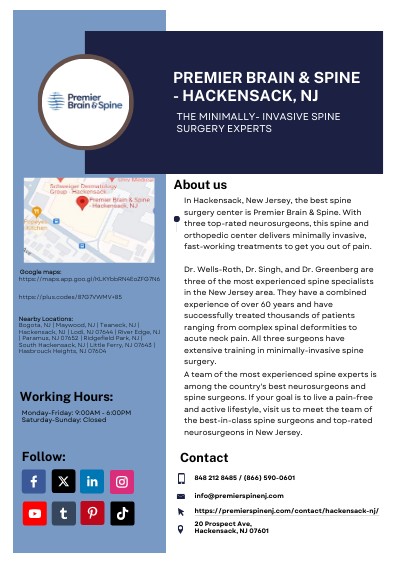 In Hackensack, New Jersey, the best spine surgery center is Premier Brain & Spine. With three top-rated neurosurgeons, this spine and orthopedic center delivers minimally invasive, fast-working treatments to get you out of pain. Dr. Wells-Roth, Dr. Singh, and Dr. Greenberg are three of the most experienced spine specialists in the New Jersey area. They have a combined experience of over 60 years and have successfully treated thousands of patients ranging from complex spinal deformities to acute neck pain. All three surgeons have extensive training in minimally-invasive spine surgery.A team of the most experienced spine experts is among the country's best neurosurgeons and spine surgeons. If your goal is to live a pain-free and active lifestyle, visit us to meet the team of the best-in-class spine surgeons and top-rated neurosurgeons in New Jersey.