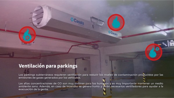 Los parkings subterráneos requieren ventilación para reducir los niveles de contaminación producidos por las emisiones de gases generados por los vehículos. Las altas concentraciones de CO son muy dañinas para los humanos y es muy importante mantener un medio ambiente sano. Además, en caso de incendio se genera humo y serán necesarios ventiladores para ayudar a la evacuación de la gente.