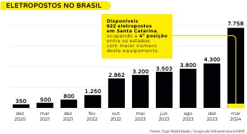 Disponíveis 622 eletropostos em Santa Catarina, ocupando a 4º posição entre os estados com maior número deste equipamento.