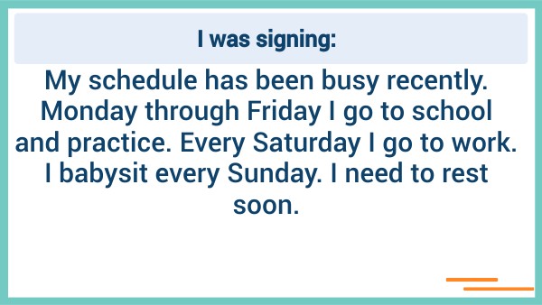 My schedule has been busy recently. Monday through Friday I go to school and practice. Every Saturday I go to work. I babysit every Sunday. I need to rest soon.