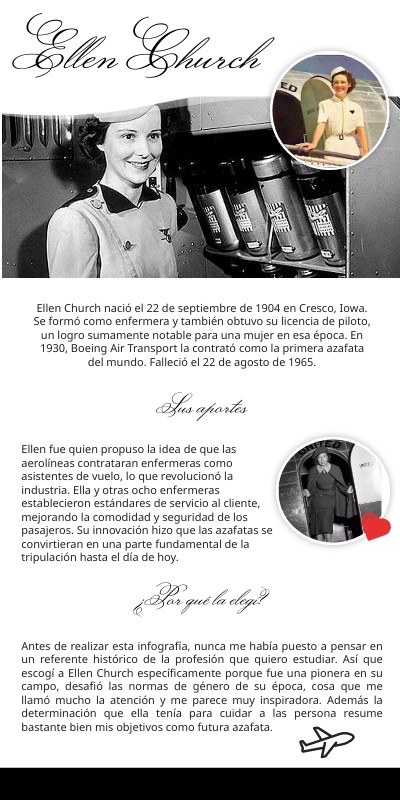 Antes de realizar esta infografía, nunca me había puesto a pensar en un referente histórico de la profesión que quiero estudiar. Así que escogí a Ellen Church específicamente porque fue una pionera en su campo, desafió las normas de género de su época, cosa que me llamó mucho la atención y me parece muy inspiradora. Además la determinación que ella tenía para cuidar a las persona resume bastante bien mis objetivos como futura azafata.