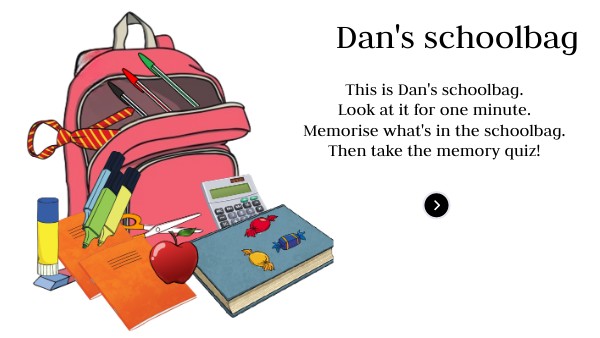 This is Dan's schoolbag. Look at it for one minute. Memorise what's in the schoolbag. Then take the memory quiz!