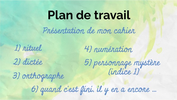 1) Sur une feuille de classeur, réalise ton défi-écriture. 2) Ecris ton prénom et le titre de ton défi. 3) Une fois ton travail terminé, pose ta feuille dans la banette "travail terminé" pour que ton travail soit corrigé. 4) Une fois corrigé, tu devras corriger tes erreurs et / ou recopier ton travail dans ton cahier d'écrivain.