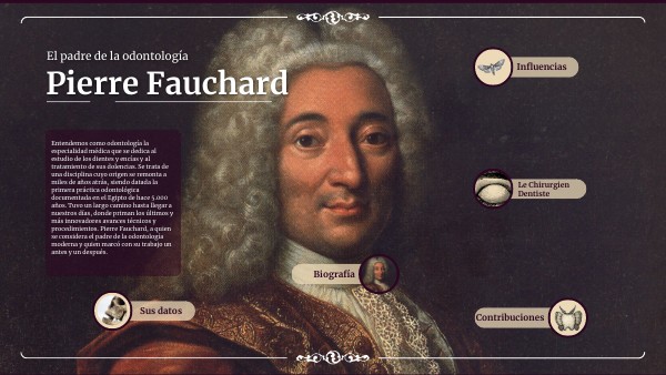 Nacido en un pequeño pueblo en Francia. Estudió medicina y se especializó en el cuidado dental. Su obra más influyente, "Le Chirurgien Dentiste" (El Cirujano Dentista), publicada en 1728, marcó un hito al ser el primer tratado completo sobre odontología. En este libro, Fauchard describió técnicas avanzadas para el tratamiento de enfermedades dentales, la restauración dental y la cirugía oral, y promovió el uso de instrumentos específicos para el cuidado dental. Fauchard también es reconocido por sus innovaciones en la técnica de los empastes dentales y por mejorar los métodos de extracción dental. Su trabajo estableció las bases para la odontología como una disciplina científica y profesional, diferenciándola de la medicina general y de la cirugía. Su influencia perduró durante muchos años y sentó las bases para el desarrollo de la odontología moderna.