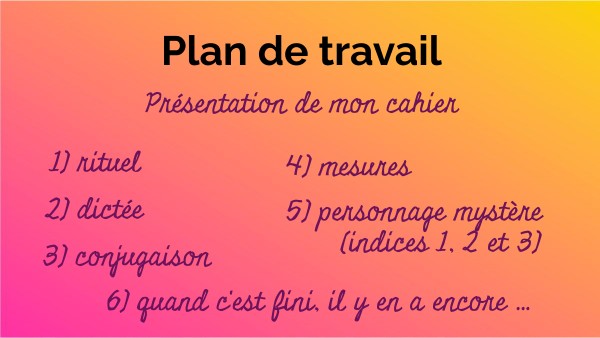 1) Sur une feuille de classeur, réalise ton défi-écriture. 2) Ecris ton prénom et le titre de ton défi. 3) Une fois ton travail terminé, pose ta feuille dans la banette "travail terminé" pour que ton travail soit corrigé. 4) Une fois corrigé, tu devras corriger tes erreurs et / ou recopier ton travail dans ton cahier d'écrivain.