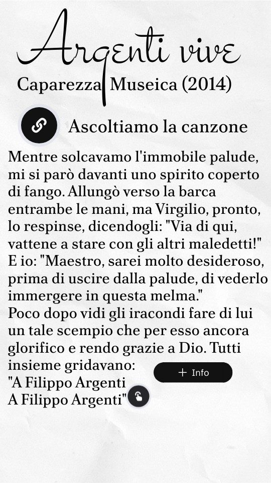 Stai lontano dalle fiamme perché ti bruciGuardati le spalle, caro Dante, è pieno di Bruti Tutti i grandi oratori sono stati fatti fuori Da signori, violenti e nerboruti Anche gli alberi sgomitano per un po' di sole Il resto sono solo inutili, belle parole Sono sicuro che in futuro le giovani menti Saranno come l'Argenti e l'arte porterà il mio nomeFilippo Argenti Filippo Argenti Filippo Argenti Filippo Argenti "Lo lasciammo là, nella palude e non racconto altro."