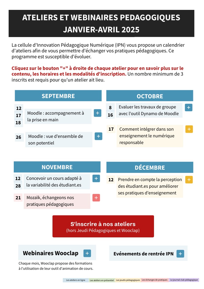 La cellule d'Innovation Pédagogique Numérique (IPN) propose un calendrier d'ateliers et de webinaires pour échanger ses pratiques et développer ses compétences pédagogiques. Ce programme est susceptible d'évoluer. Cliquez sur le bouton "+" à côté de chaque événement pour en savoir plus sur le contenu, les horaires et les modalités.
