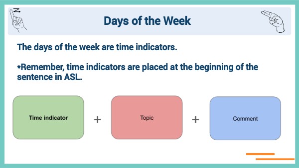 The days of the week are time indicators. *Remember, time indicators are placed at the beginning of the sentence in ASL.